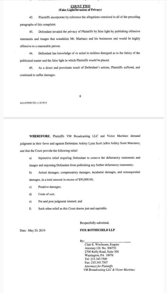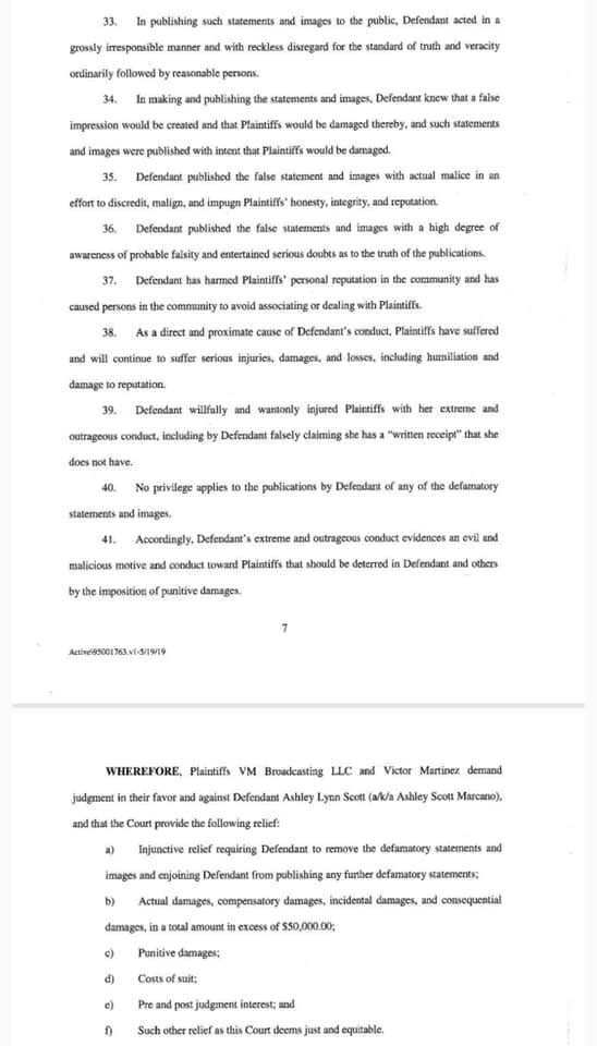 El comunicador puertorriqueño acusa a la hija del alcalde Wally Scott de ocasionar, a través de sus acciones, comentarios y memes, daños a su persona, a su credibilidad y a su carrera de 30 años como profesional del periodismo y la radiodifusión en los Estados Unidos.