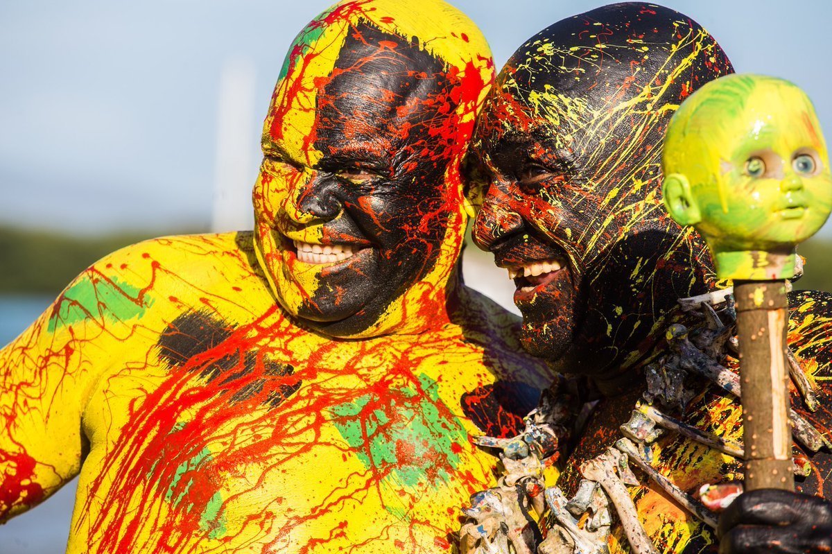 En Barahona, en tiempo de Carnaval las calles se tiñen de color y rebeldía con Los Pintaos: negros cimarrones alegres, verdaderos arcoiris danzantes. ¿Su disfraz? Collares que cuelgan y el pintao en sus cuerpos.