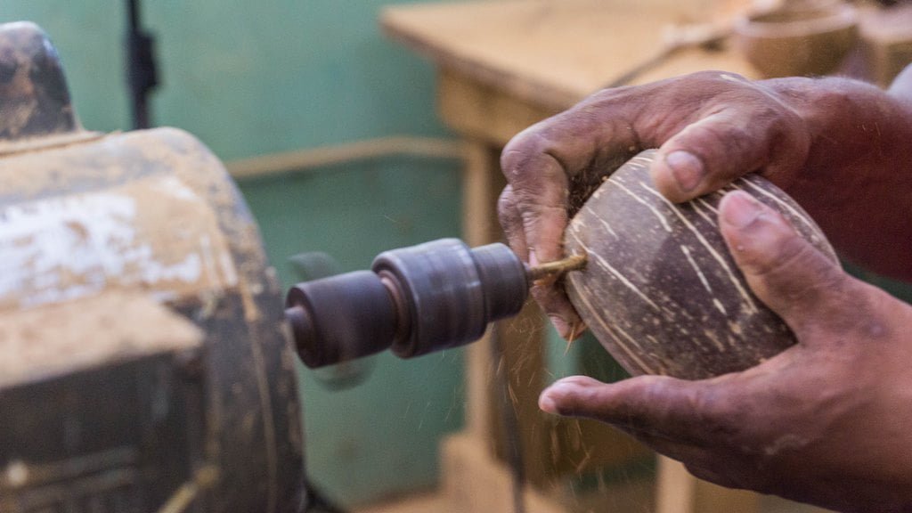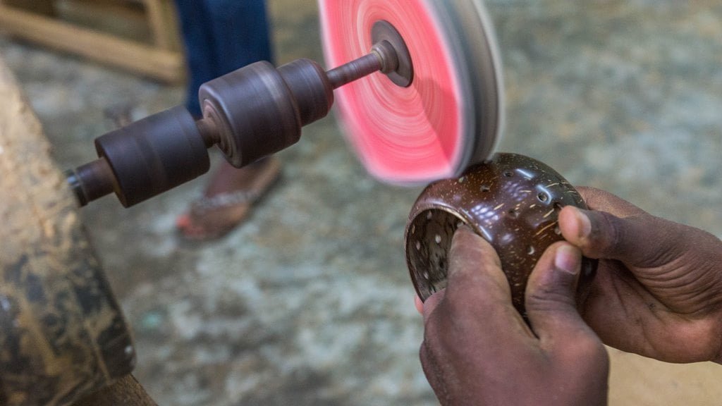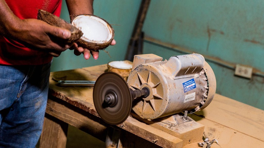 La jícara de coco, su materia prima, la consigue fácil, pues en esta provincia situada al este de la República Dominicana abundan los cocotales.